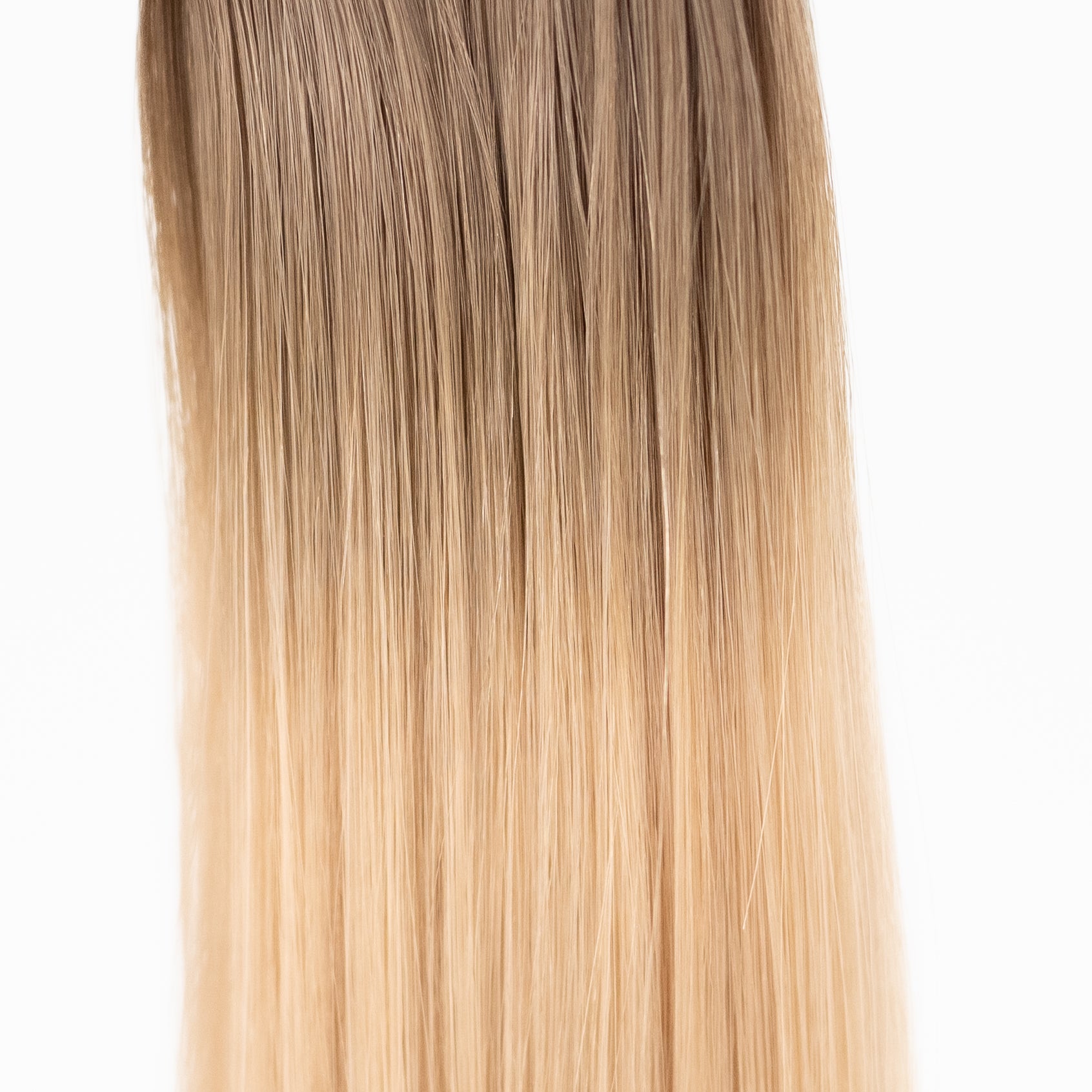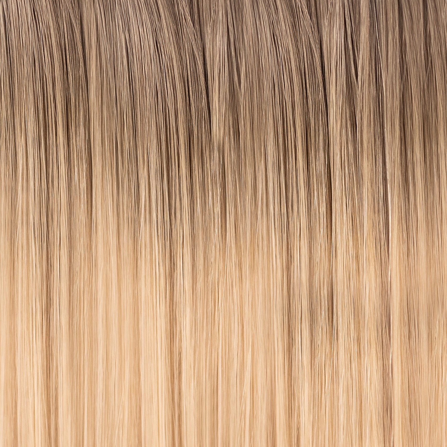 Cheekie starts with a dirty blonde root, smoothly blending into a solid peachy neutral-toned blonde. This elegant gradient offers a fresh and modern look, with a seamless transition from deeper roots to radiant, warm blonde ends.